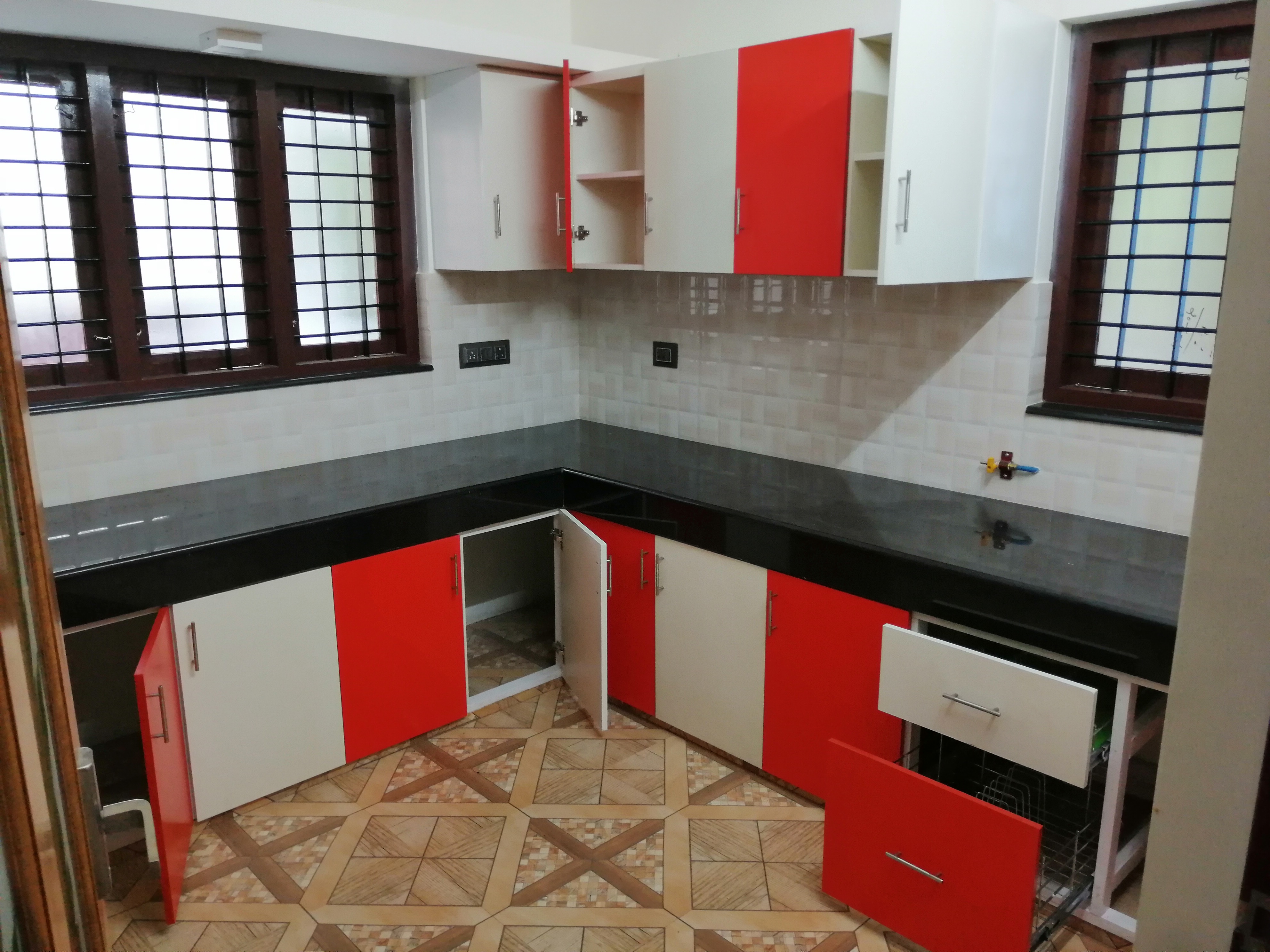 Spacious kitchen with cabinets and bedroom with 3 panel cabinets