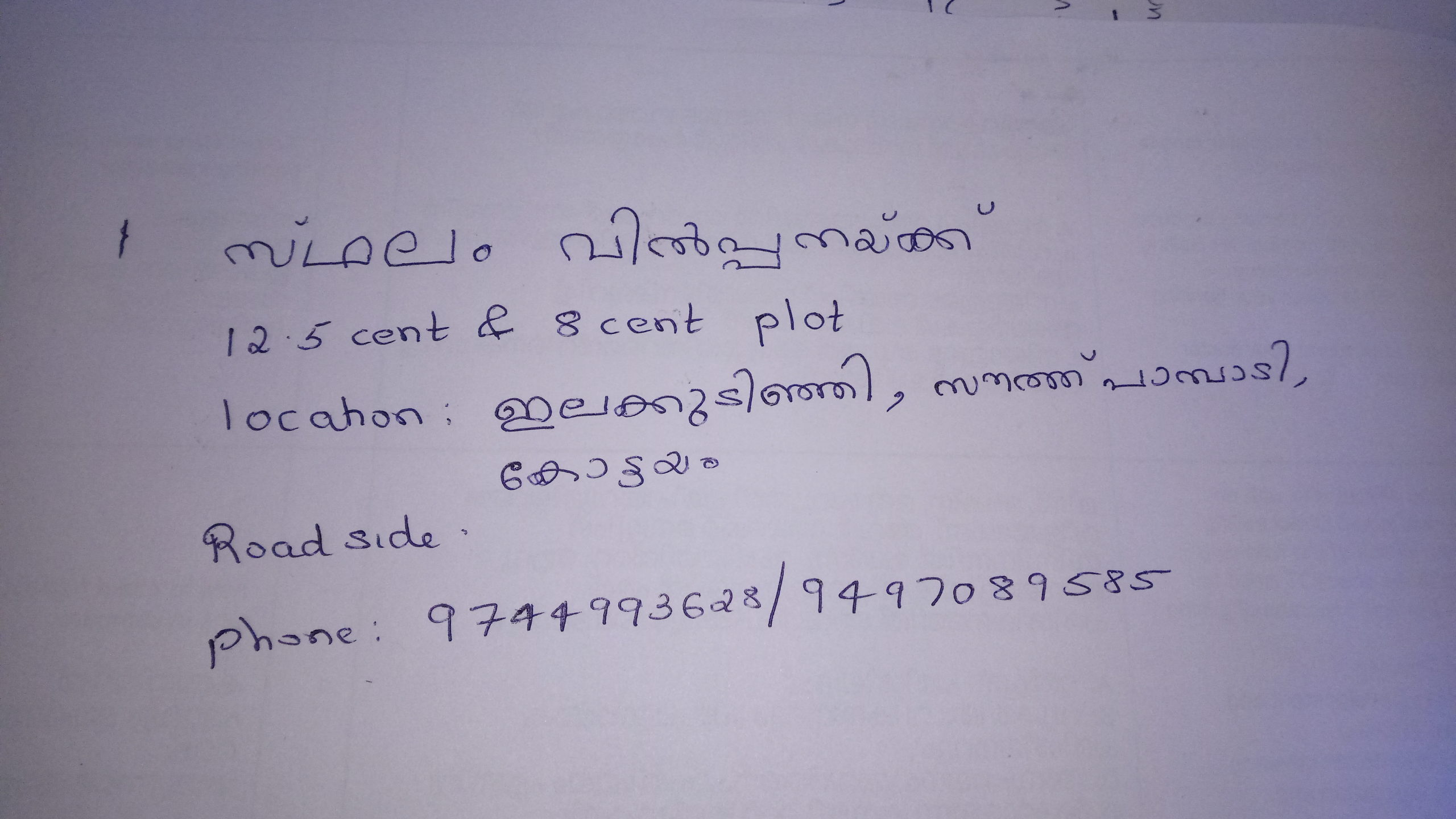 Plot for sale – 12.5cent and 8 cent in elakudinji, pampady, kottayam. Roadside. Price negotiable. Contact : 9744993628/ 94970895857
